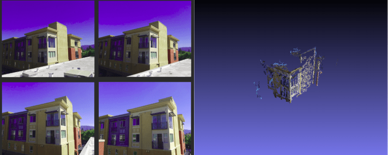 A series of pictures were taken by a local pizzeria. I ran the program with the full image set, and then with only 3 images out of curiosity. The full image set created a much fuller “face” of the building in the left point cloud.. Using 3 images highlighted the right angle of the building as shown in the image on the right. The perspective was taking from the top to show the joining of the front face and the right facade. It would be interesting to see how one can merge Pointclouds in the future.